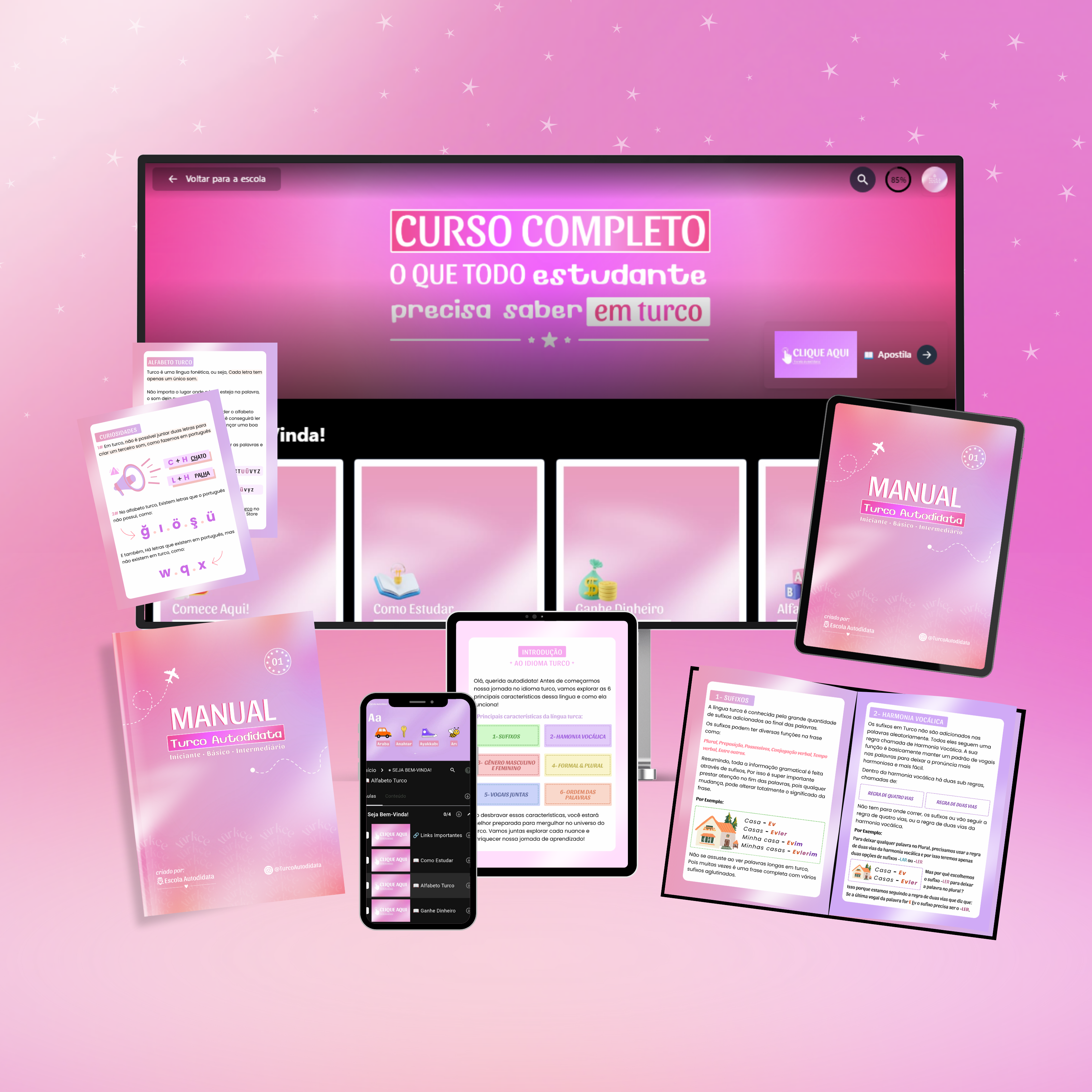 Você vai ter TUDO o que precisa estudar em turco reunidos em um único material: São 100 lições cobrindo todos os temas: Fonética, Vocabulário, Frases Úteis, Gramática, Sufixos, Verbos e Tempos Verbais, seguindo a exata ordem de aprendizado, para você avançar no idioma gradativamente com mais facilidade!