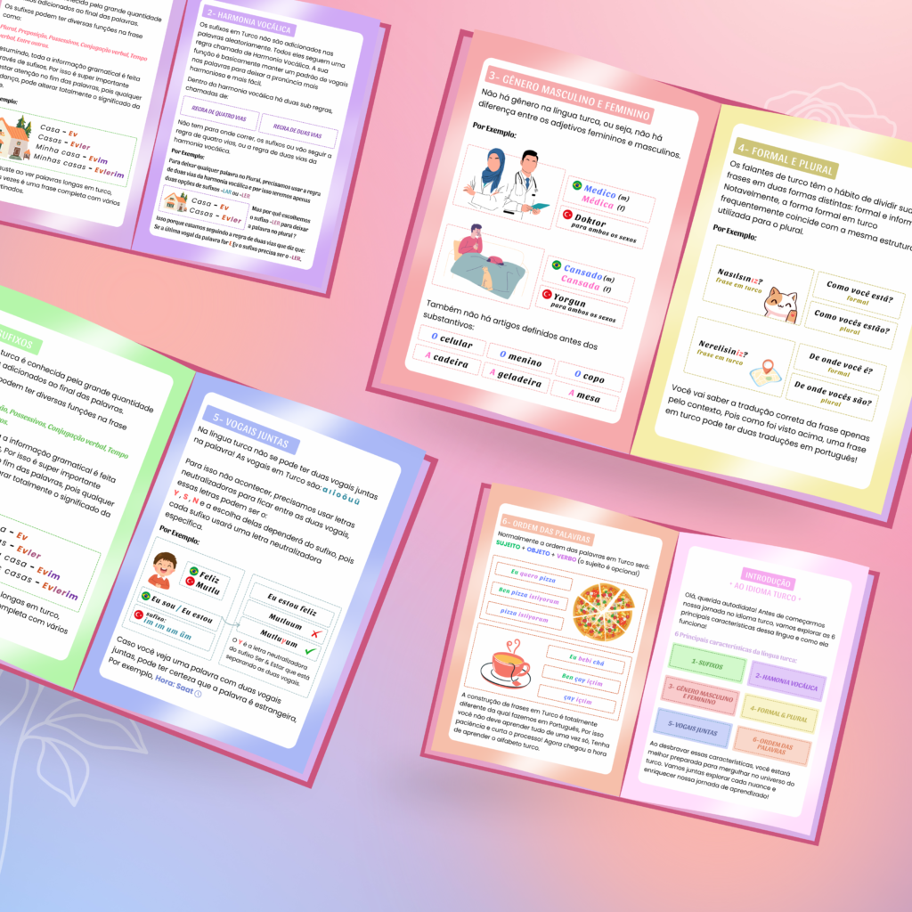 Você tem tudo o que precisa em suas mãos: um método fácil, prático e que cabe no seu tempo. Não adie mais o sonho de falar turco! Imagine-se conversando com seus amigos turcos, entendendo músicas, séries e até mesmo viajando pela Turquia com mais confiança.