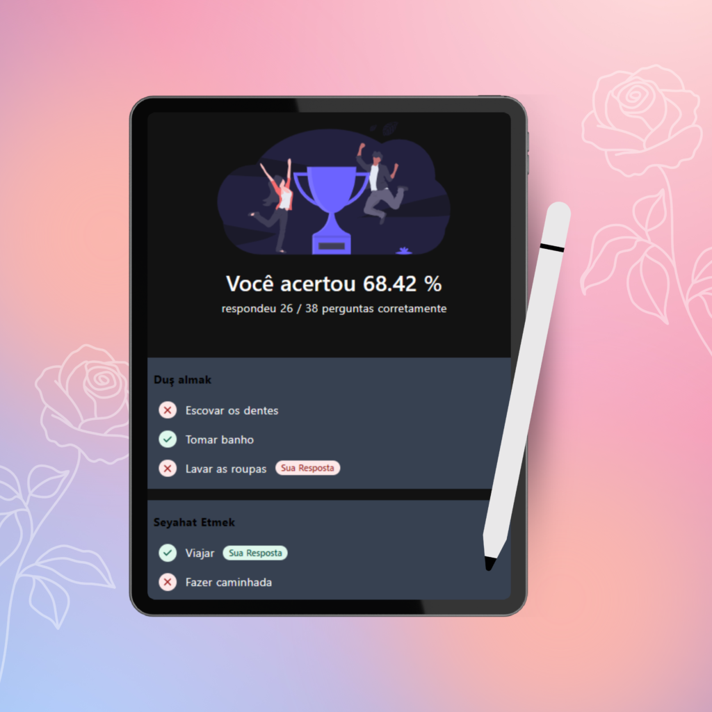 O Manual Turco Autodidata foi desenvolvido com base em nossa experiência no ensino e aprendizado de idiomas. E ele foi cuidadosamente elaborado para garantir que você, de forma autodidata, aprenda de forma eficaz e prática. As estudantes que já usaram nossos materiais têm aprovado e alcançado ótimos resultados!